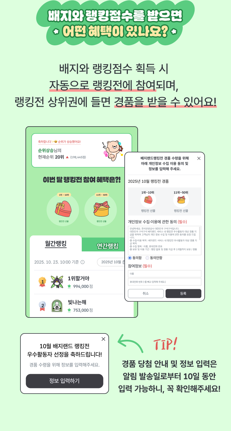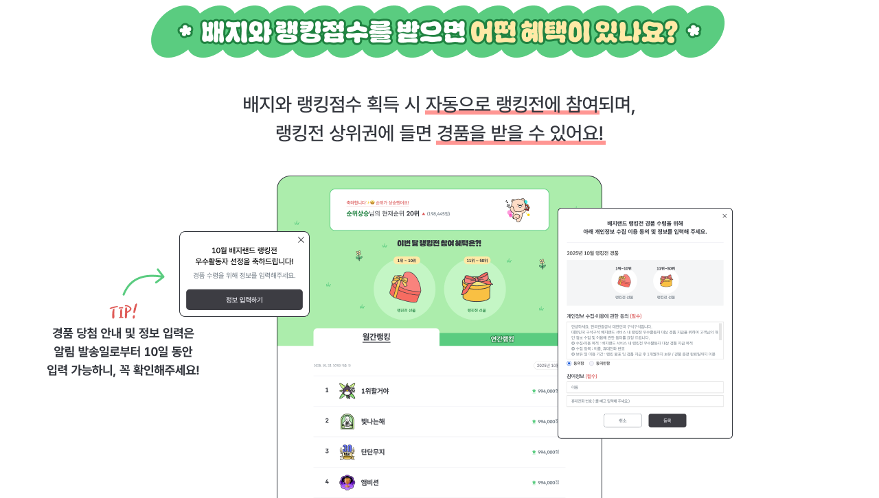 배지와 랭킹점수 획득 시 자동으로 랭킹전에 참여되며, 랭킹전 상위권에 들면 경품을 받을 수 있어요!