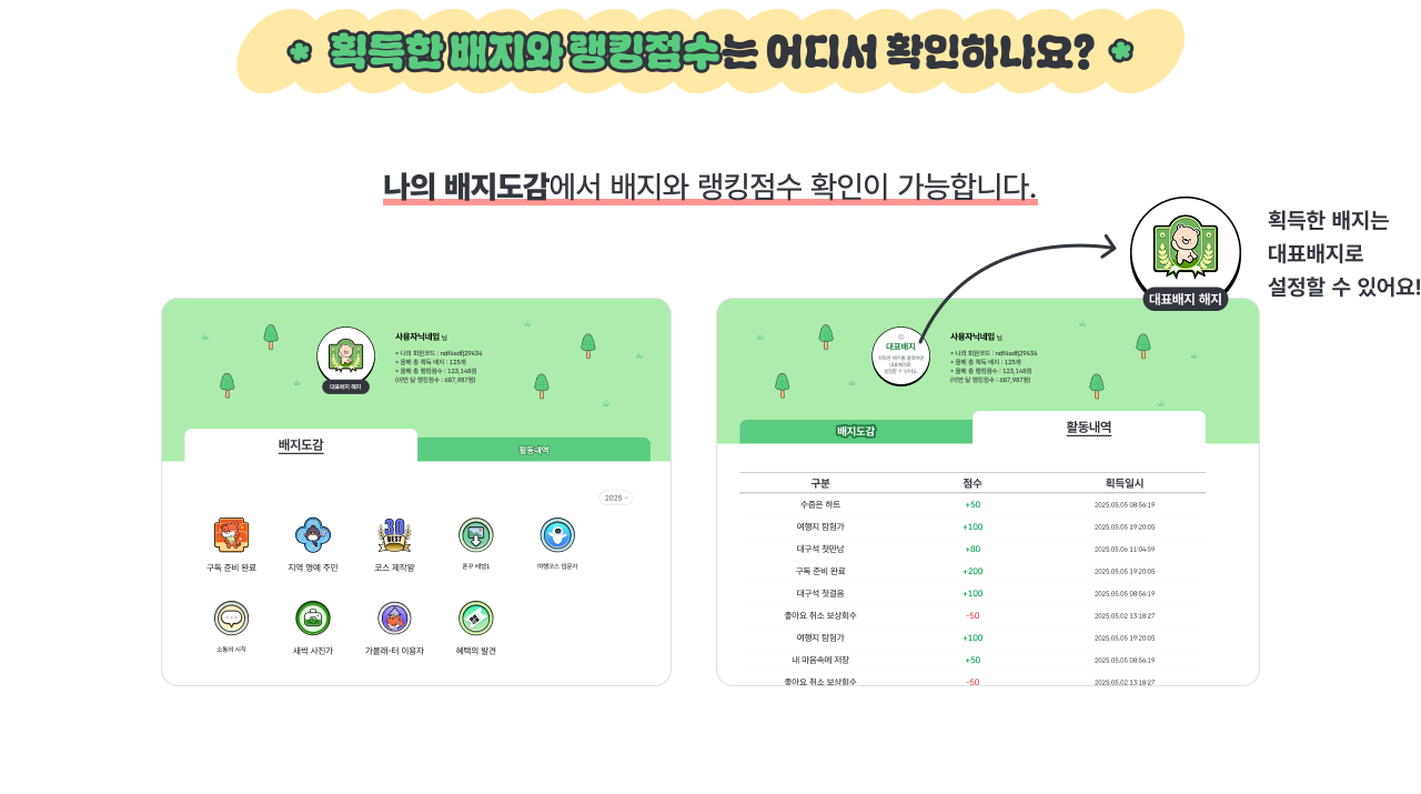 획득한 배지는 대표배지로 설정할 수 있어요!