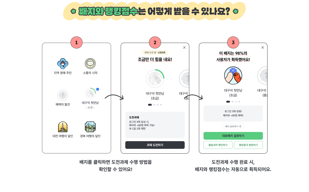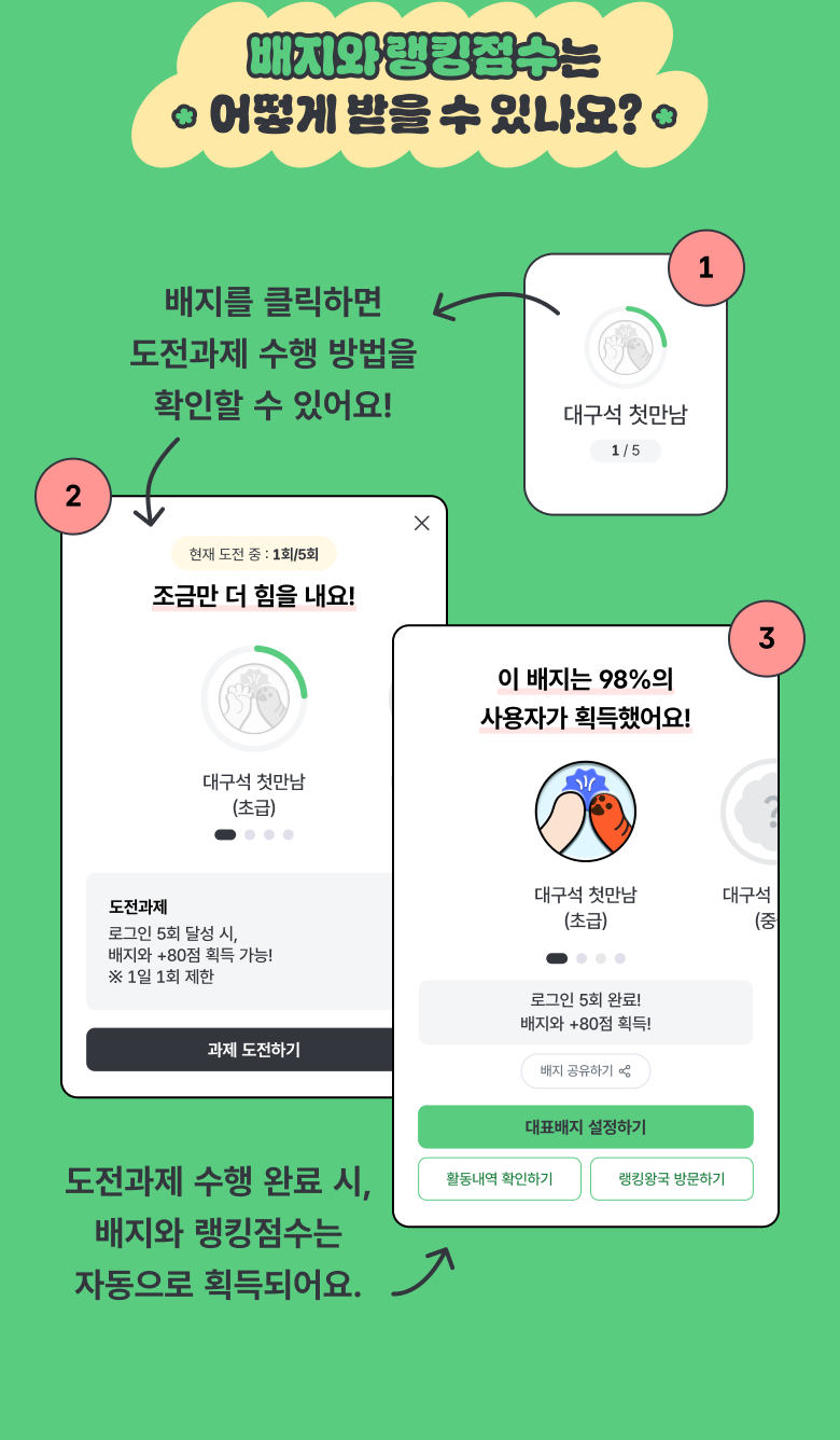 - 도전과제 수행 완료 시, 배지와 랭킹점수는 자동으로 획득되어요.
